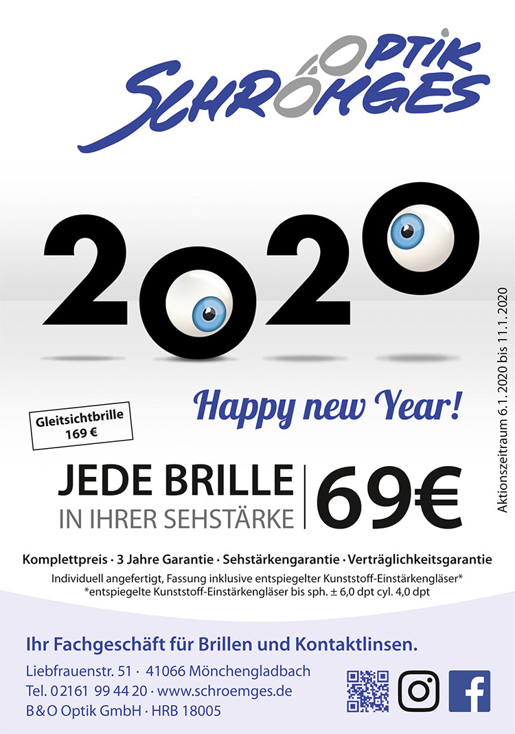Happy New Year! Wir starten das Jahr – wie immer – traditionell: Vom 6. bis zum 11. Januar 2020 kostet jede Brille in Ihrer Sehstärke bei uns 69,- Euro, als Gleitsichtbrille 169,-Euro. Individuell angefertigt, entspiegelte Kunststoff-Gläser (sph. bis 6 Dpt / cyl. bis 4 Dpt) und Brillenfassung inklusive.
